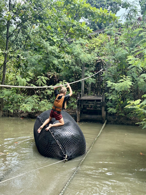 Außerdem ein Highlight, das in diesem Artikel nicht fehlen darf: Die Get Growing Community Farm. Sie befindet sich in „Bangkoks grüner Lunge“ Bang Kachao. Schon die Anreise dorthin ist ein kleines Abenteuer. Man nimmt am Wat Khlong Toei Nok Pier ein kleines Boot und fährt einmal über den Chao Praya River, um auf der anderen Seite ein Bangkok zu erleben, in dem die Zeit stillzustehen scheint. Auf der Get Growing Community Farm erwartet Kids ein Abenteuer-Spielplatz der Extra-Klasse im Grünen! Spoiler: Hier geht garatntiert niemand sauber nach Hause.