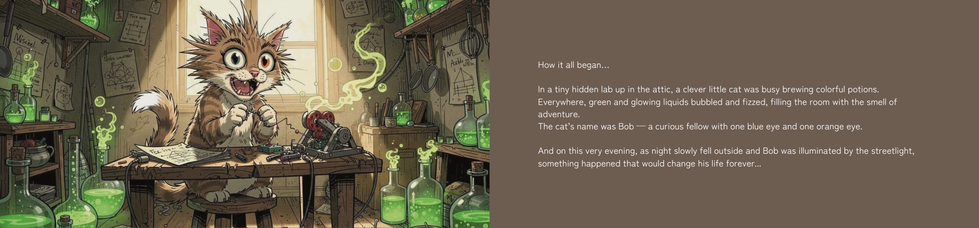 When the curious cat Bob accidentally opens the wrong magical potion in his attic lab, a portal rips through time and space and flings him straight into a dangerous prehistoric world. There, Bob encounters not only giant dinosaur-cats, but also a mysterious glowing egg that changes everything.